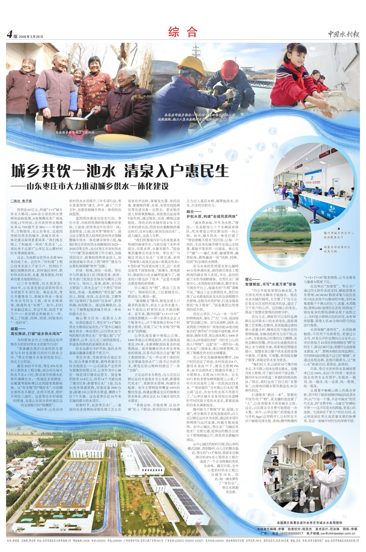 拧成一股绳,劲往一处使。枣庄市与所属各区(县)两级党委、政府、有关部门及国企在纵向与横向上同时发力。纵向上,党委、政府、水行政主管部门、供水企业“三个责任”环环相扣,形成一条清晰的“责任链”;横向上,财政、发改、生态环境、卫健等部门也领到了各自的“任务单”,职责明确,协同配合。通过纵横联动,全市上下凝聚起推进城乡供水一体化的强大合力。